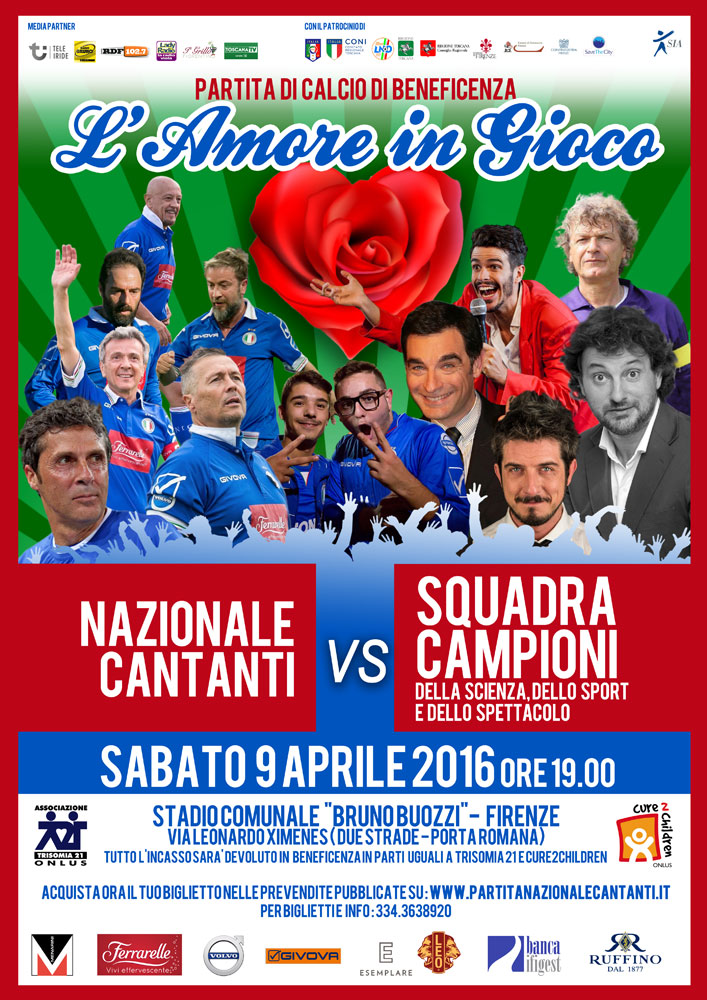 Sabato 9 aprile 2016 presso lo Stadio Bruno Buozzi di Firenze, si terrà l’ evento e la partita di calcio a scopo benefico, denominata “l’Amore in gioco”.