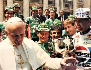 IF: Di Gino Bartali, il Signore ne ha fatto soltanto uno. Magari averne avuti di più … comunque, mettendo da parte il sarcasmo, ricordo Gino con immenso affetto. E pensate che nel 1984, al mio primo anno di professionismo come presidente del Team Fanini, avevo proprio lui come direttore sportivo, insieme all’amico di una vita Piero Pieroni. Un onore ed un privilegio che custodirò caro per sempre. Ricordo tutti i suoi insegnamenti e la grinta che riusciva ad infondere agli atleti e a tutti noi che gli stavamo vicino. Magia pura. E qui mi fermo altrimenti non smetterei più di raccontare e tra ricordi ed aneddoti ci potrei scrivere un libro. Per il resto, tra le mie file sono passati davvero migliaia di ciclisti, molti anche con diverse credenze religiose, però quando arrivavamo in Vaticano, davanti al Santo Padre, anche chi non credeva, rimaneva coinvolto, come catapultato in un'altra dimensione. La luminescenza di Karol Wojtyla, era accecante. Qualcosa fuori dal comune che con semplici parole non si può spiegare. Bastava un suo piccolo gesto o uno sguardo e tutti rimanevamo ipnotizzati. E alla fine quando andavamo via, tutti (atleti, sponsor, personale) venivano a ringraziarmi per averli fatti vivere una tale esperienza.